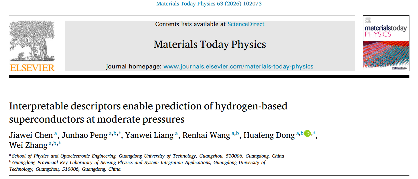 本研究由广东工业大学物理与光电工程学院董华锋、章伟团队完成,第一作者为研究生陈嘉维和彭俊豪博士。团队通过符号回归方法构建的高精度 Tc 预测模型,成功预测氢基超导体在常压下超导转变温度超越 MgB2(42.04 K),为高温超导机理研究提供了新平台。( Materials Today Physics, IF 9.7, DOI:10.1016/j.mtphys.2026.102073)