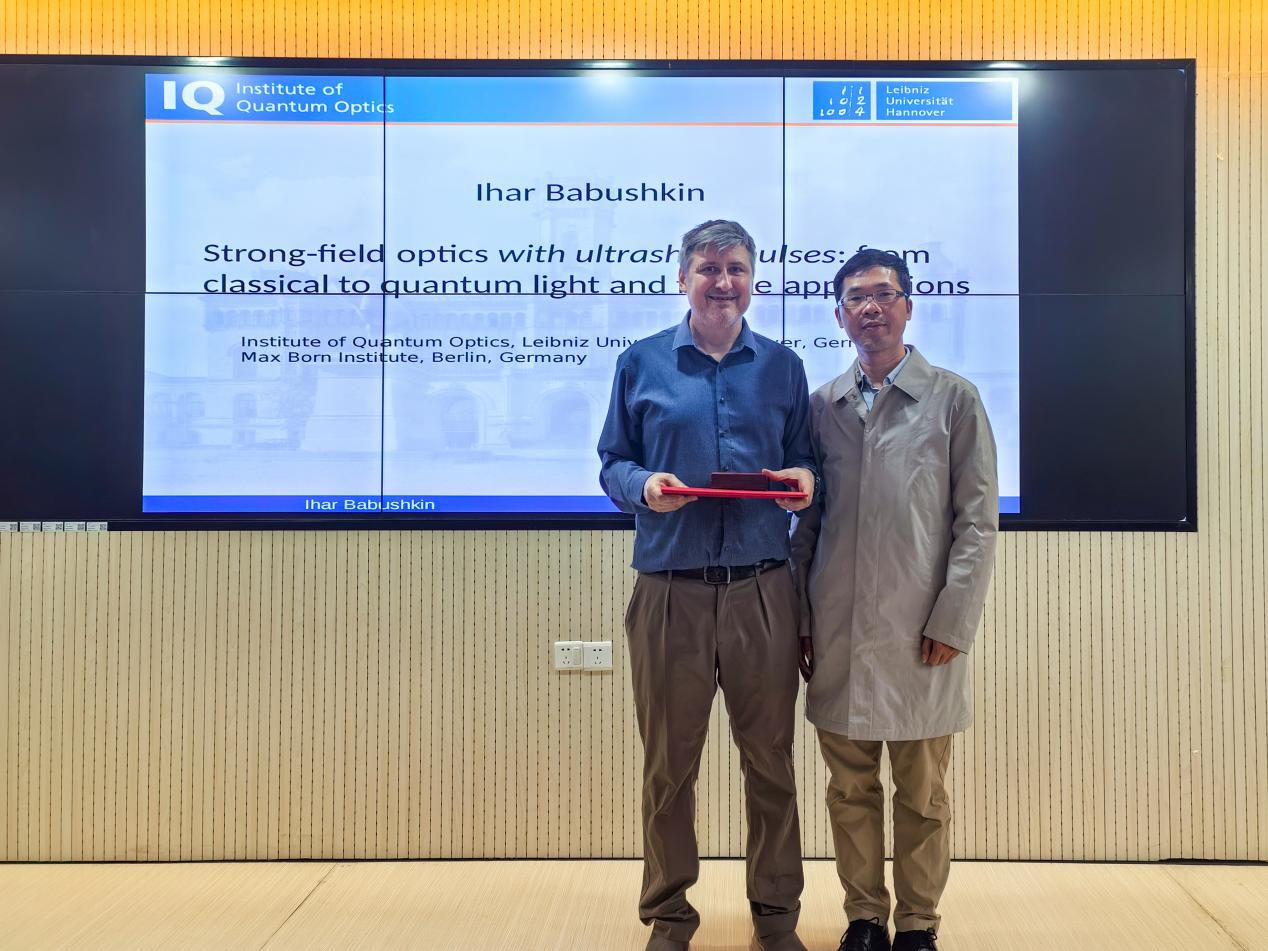 讲座中,Ihar Babushkin教授围绕强场光学领域的前沿动态与核心研究展开系统分享。他以2024年诺贝尔物理学奖相关研究成果为切入点,深入浅出地阐释了强场光学(即能够电离原子的光场)与量子光学的跨学科融合逻辑——二者打破传统研究边界,前者聚焦海量光子的相互作用机制,后者侧重少数光子的动力学特性,这种跨域协同效应正为量子成像、量子计算等关键领域带来革命性突破。随后,教授结合自身团队及国际同行的最新研究成果,详细解读了强场与量子光学交叉领域的技术创新进展,并对其在量子计算、量子成像等场景中的未来应用前景进行了前瞻性展望,充分展现了该领域广阔的研究空间与发展潜力。